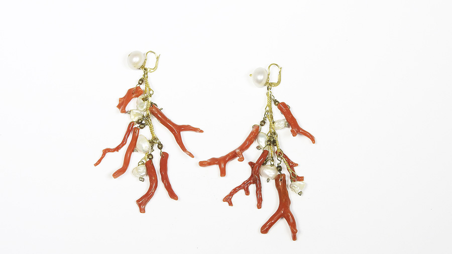 PAIO DI ORECCHINI CHANDELIER IN ORO pendenti realizzati in rametti di corallo...