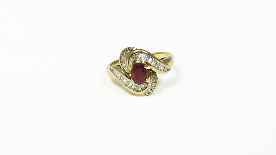 ANELLO IN ORO GIALLO CON RUBINO E DIAMANTI rubino taglio ovale ct 0,60 circa, diamanti taglio tape ct 0,90 circa complessivi, gr 6,2 RUBY AND TAPERED DIAMONDS YELLOW GOLD RING