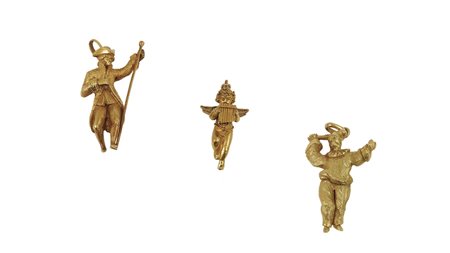 TRE CHARMS IN ORO GIALLO raffiguranti un putto e due maschere veneziane gr 25,2 THREE YELLOW GOLD PENDANTS DEPICTING AN ANGEL AND TWO VENETIAN MASKS