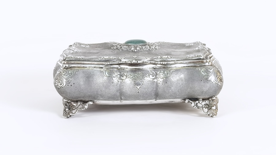 COFANETTO IN ARGENTO SATINATO prima metà del XX secolo di forma sagomata, coperchio con pietra dura cabochon incastonata, cesellato con volute e girali gr 845 SILVER BOX, FIRST HALF OF 20TH CENTURY