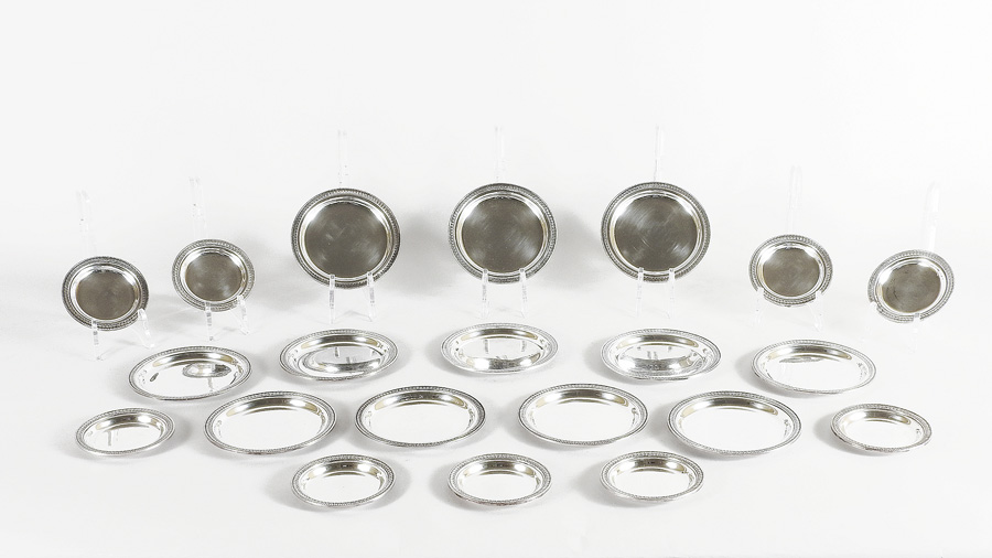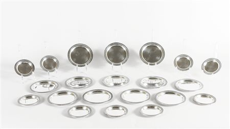 SERIE DI VENTUNO SOTTOBICCHIERI IN ARGENTO bordo a palmette, due dimensioni...