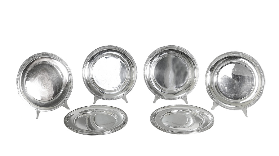 SERIE DI DODICI SOTTOPIATTI IN ARGENTO bordi sbalzati con motivo a palmette gr 5110 A SET OF TWELVE SILVER UNDERPLATES