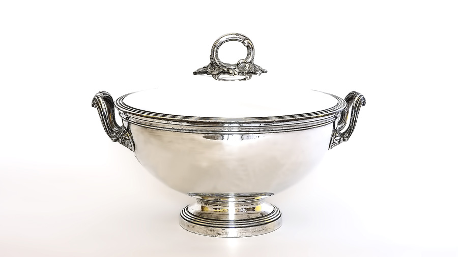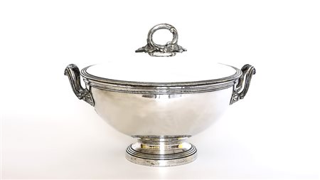 ZUPPIERA IN RAME ARGENTATO Francia, metà del XIX secolo coperchio con presa sbalzata con foglie, manici laterali a doppia voluta h cm 23 SILVER ON COPPER TUREEN, FRANCE, MID 19TH CENTURY