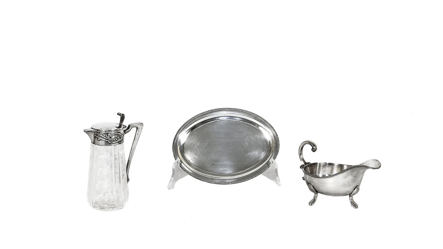 LOTTO un piattino ovale ed una salsiera in sheffield ed una piccola caraffa in cristallo molato rilegata in argento (3)