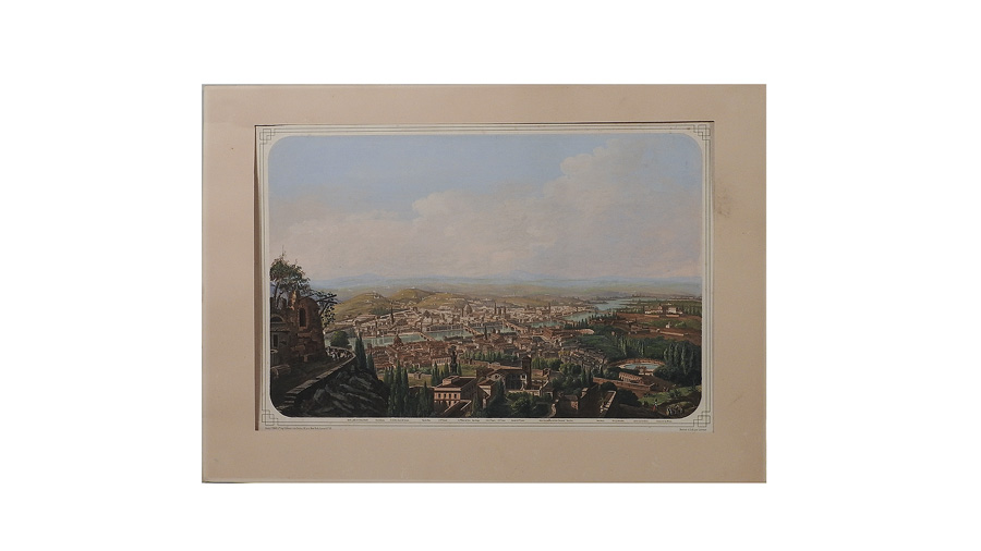 VEDUTA GENERALE DI FIRENZE Francia, metà del XIX secolo litografia acquerellata, difetti ai margini cm 31x47,5 GENERAL VIEW OF FLORENCE, FRENCH, MID 19TH CENTURY, WATERCOLOURED LITHOGRAPH
