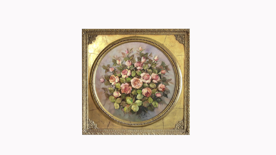 TRIONFO DI ROSE olio su tavoletta in tondo, firmato GR Gallo, in cornice diam cm 58 ROSES, OIL ON CAVANS