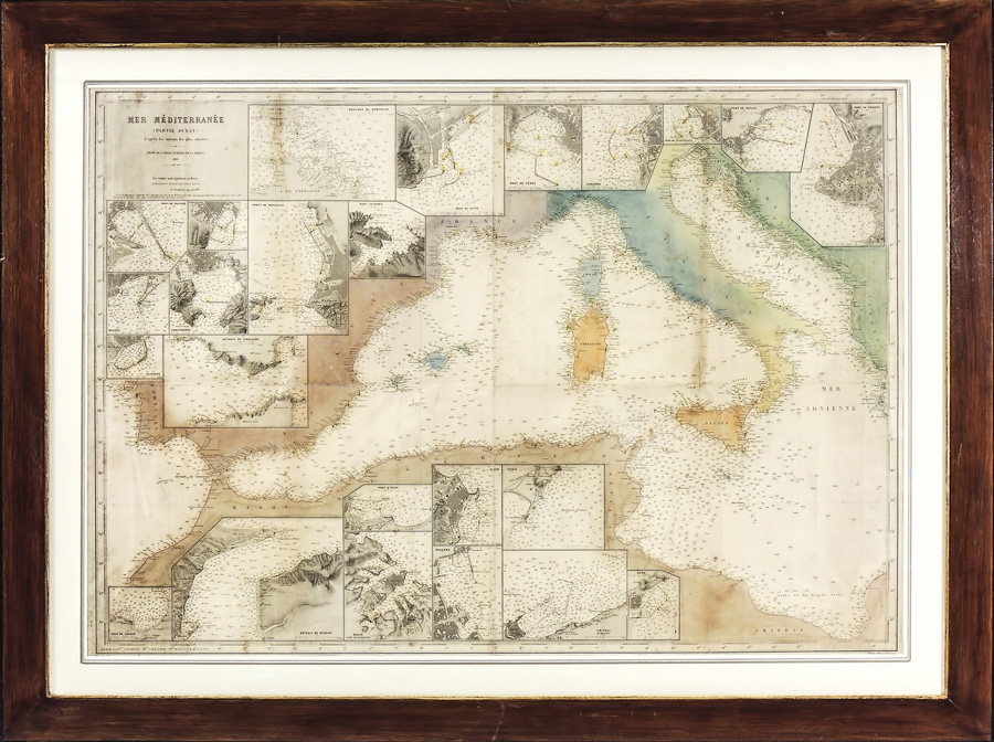 CARTA GEOGRAFICA DEL MAR MEDITERRANEO 1881 incisione, in cornice cm 67x98 PLANT OF MEDITERRANEAN, ENGRAVING