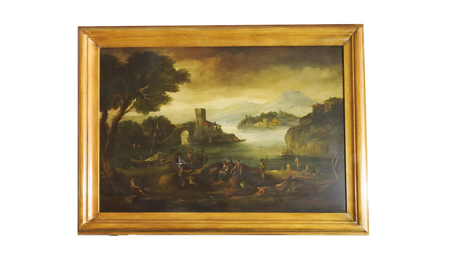 SCUOLA OLANDESE DEL XX SECOLO Paesaggio fluviale con pescatori olio su tela, in cornice difetto cm 106,5x156 DUTCH SCHOOL OF 19TH CENTURY, RIVER LANDSCAPE, OIL ON CANVAS