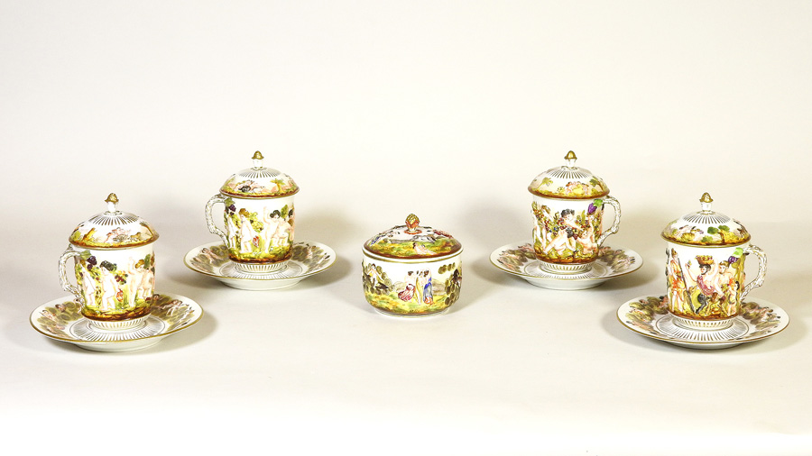 SERIE DI QUATTRO TAZZINE CON COPERCHIO IN PORCELLANA istoriate con giochi di putti e scene mitologiche, corredate da piattini e zuccheriera, difetti (5) A SET OF FOUR PORCELAIN LIDDED CUPS