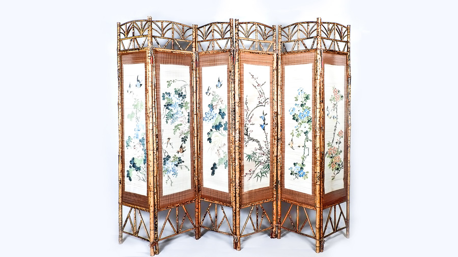 PARAVENTO ORIENTALE A SEI ANTE IN BAMBÙ con pannelli dipinti con uccellini e...