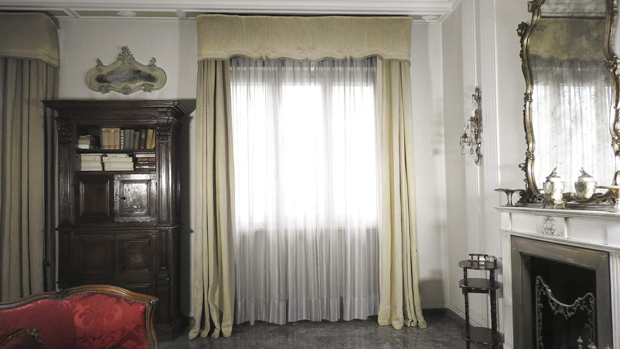 TRE COPPIE DI TENDE IN SETA CORREDATE DA TENDONI E MANTOVANE in filaticcio...