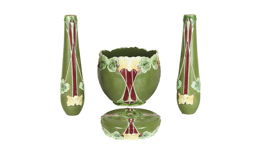 LOTTO DI TERRAGLIE FRANCIA, inizio del XX secolo decorate in rielivo con motivi di gusto liberty nei toni del verde, del giallo e del bordeaux, composto da coppia di basi da lumi, un portavasi ed uno sottovaso (4) POTTERY LOT, FRANCE, EARLY 20TH CENTURY