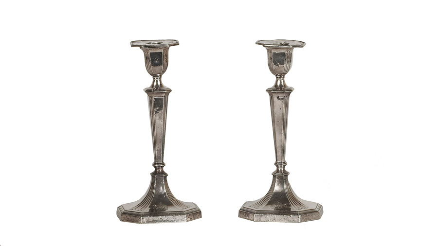 COPPIA DI CANDELIERI IN SHEFFIELD fusto a faretra, su base ottagonale in parte baccellata ed incisa con corona, lievi difetti h cm 24 PAIR OF SHEFFIELD CANDLESTICKS