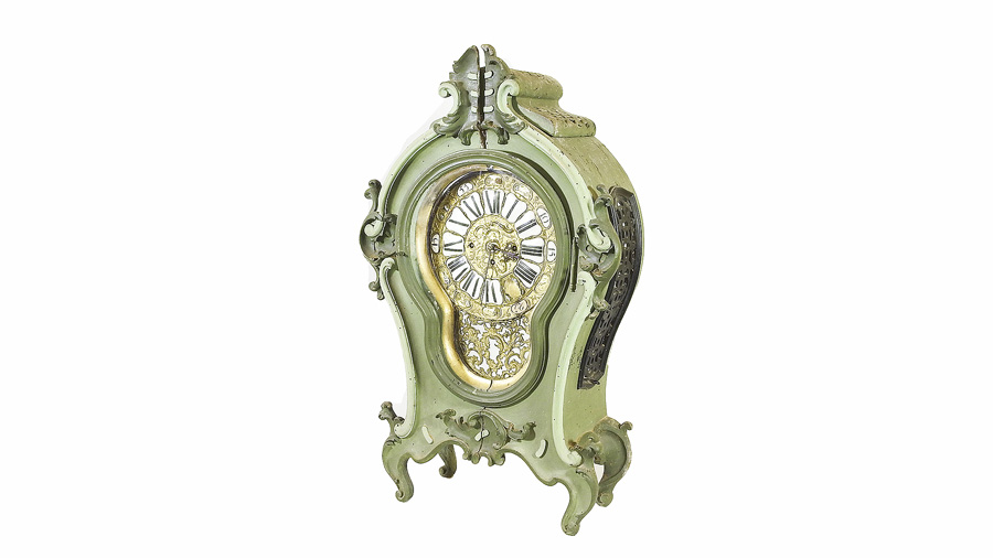 OROLOGIO DA MENSOLA IN LEGNO TENERO DIPINTO VERDE XVIII secolo quadrante in bronzo dorato con numeri in smalto bianco, mancanze cm 82x52 GREEN PAINTED WOODEN MANTEL CLOCK, 18TH CENTURY