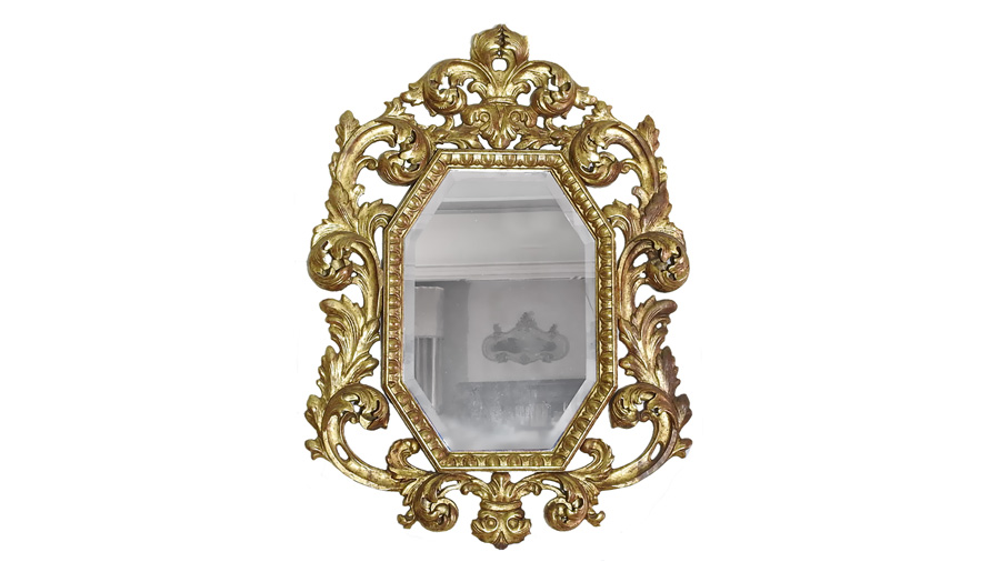 SPECCHIERA IN LEGNO INTAGLIATO E DORATO realizzata in stile seicentesco, cornice ottagonale ad ovoli, con ricche cascate laterali intagliate con volute di foglie d'acanto cm 130x93 GILTWOOD MIRROR