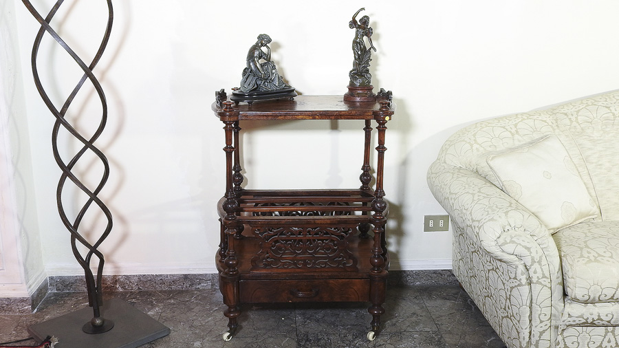TAVOLINO DI SERVIZIO IMPIALLACCIATO IN RADICA DI NOCE Inghilterra, seconda metà del XIX secolo piano sagomato, vano portabottiglie con sponde traforate ed un cassetto sottostante, sostegni torniti, piedini con rotelle h cm 97x71x46 WALNUT VENEERED SERVICE TABLE, ENGLAND, SECOND HALF OF 19TH CENTURY