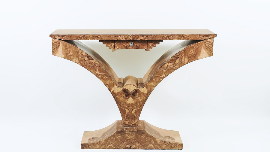 CONSOLE IMPIALLACCIATA IN RADICA DI ACERO realizzata in stile Art Déco, piano...