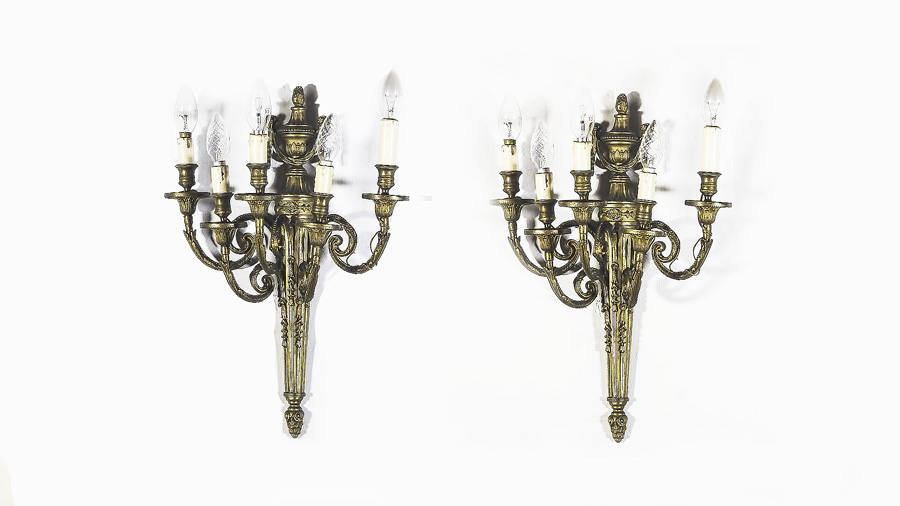 SERIE DI OTTO APPLIQUES IN BRONZO IN STILE NEOCLASSICO, fusto a faretra, cinque bracci portacandela su due ordini, finale a vaso h cm 50 A SET OF EIGHT BRONZE WALL LAMPS