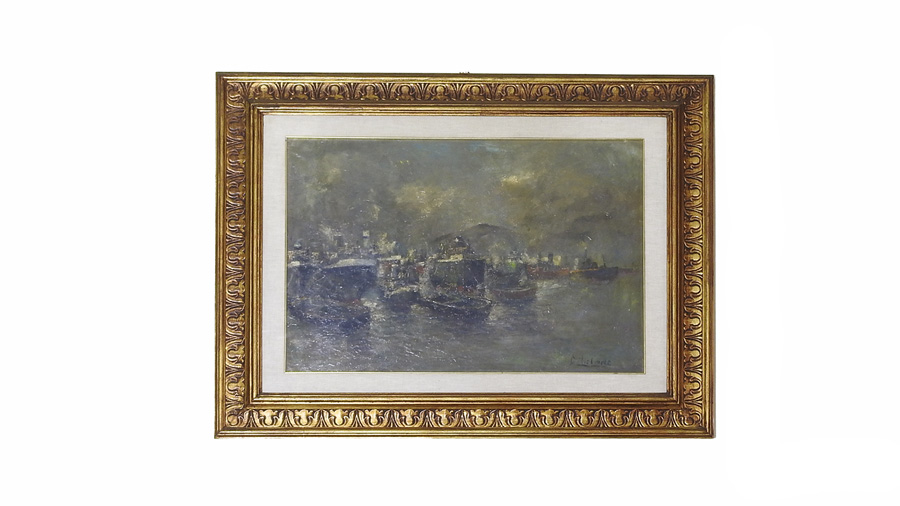 SCORCIO DI PORTO CON BARCHE olio su tela, firmato, in cornice cm 50x69,5 PORT VIEW WITH BOATS, OIL ON CANVAS