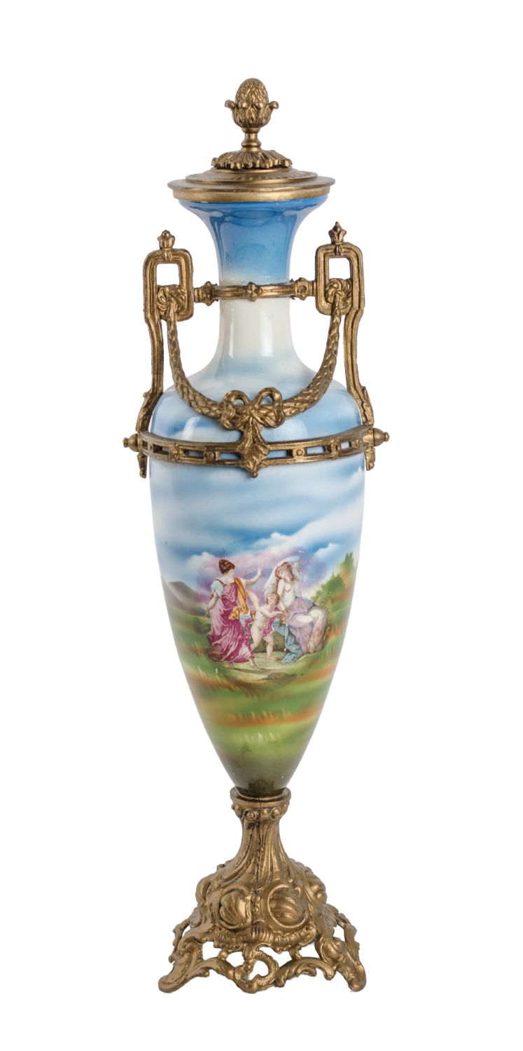 POTICHE in ceramica decorata, base, manici e coperchio in metallo. Italia primi '900 Misure: h cm 48