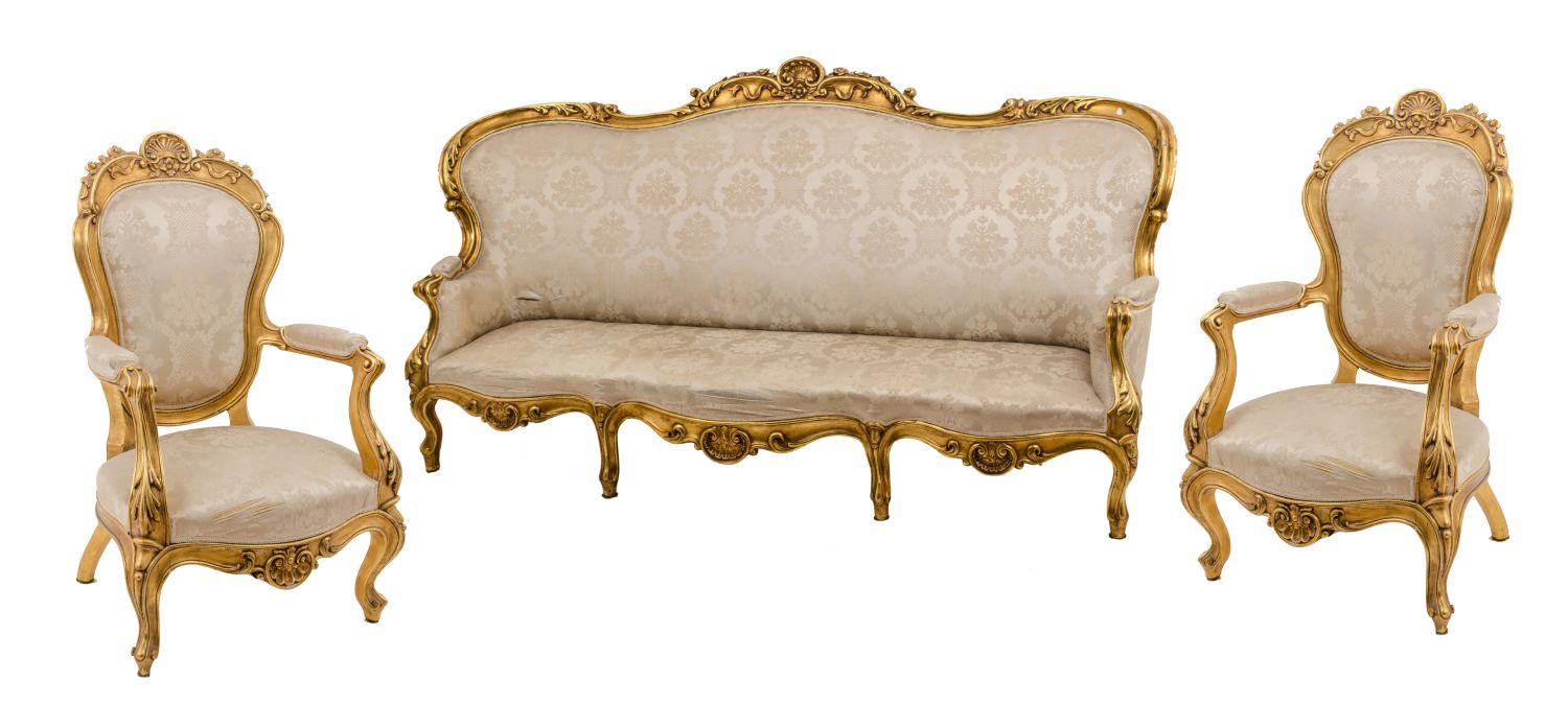 SALOTTO Luigi Filippo composto da DIVANO e da due POLTRONE in legno dorato, tappezzato con stoffa damascata. Sicilia XIX secolo Misure: varie