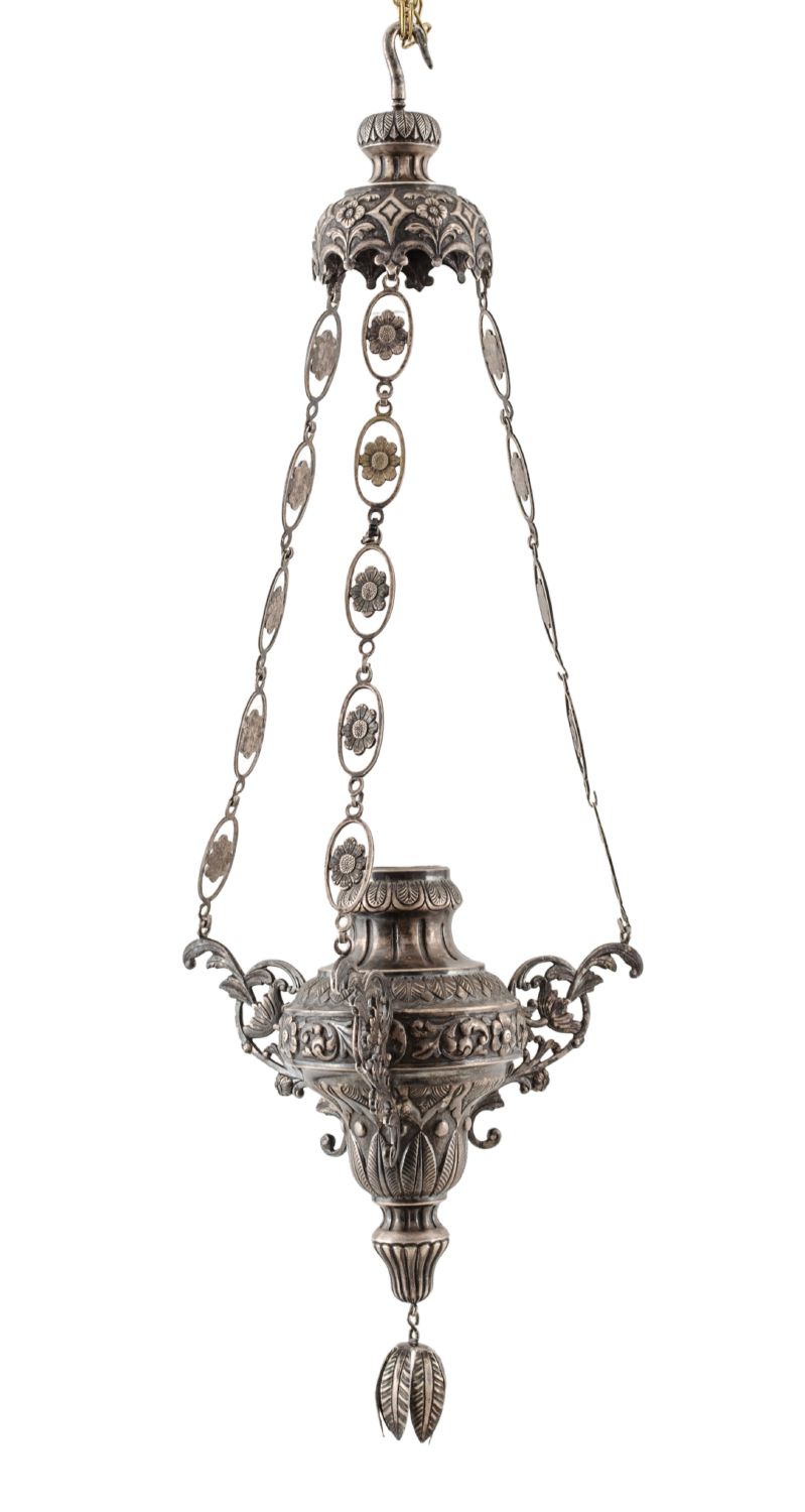 LAMPADA votiva in argento (g. 677). Portogallo XIX secolo Misure: h cm 61