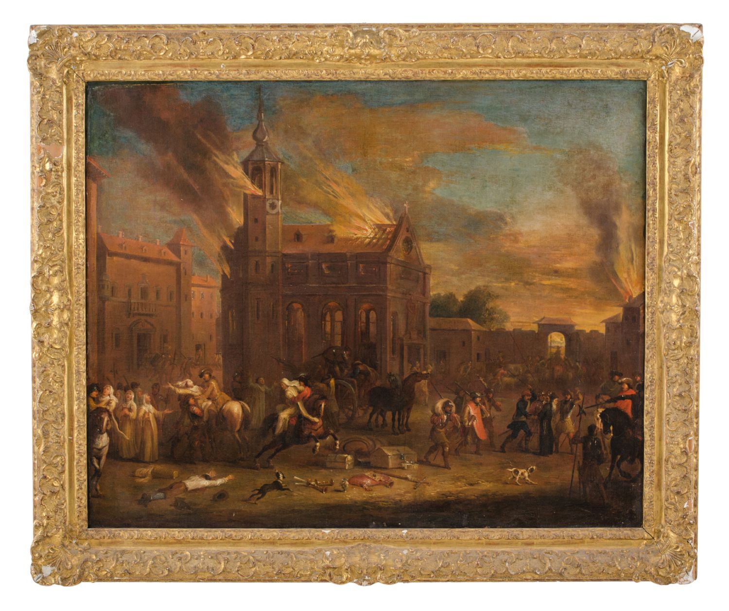 DANIEL VAN HEIL (1604 - 1664) OLIO su tela "convento in fiamme" entro cornice coeva dorata. Misure: cm 94 x 76