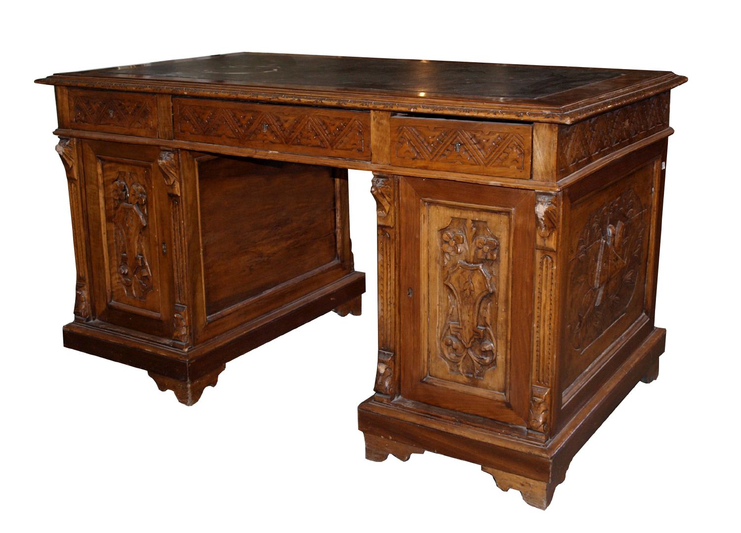 SCRIVANIA a scagno in noce decorata da intagli, piano in pelle verde. Sicilia...