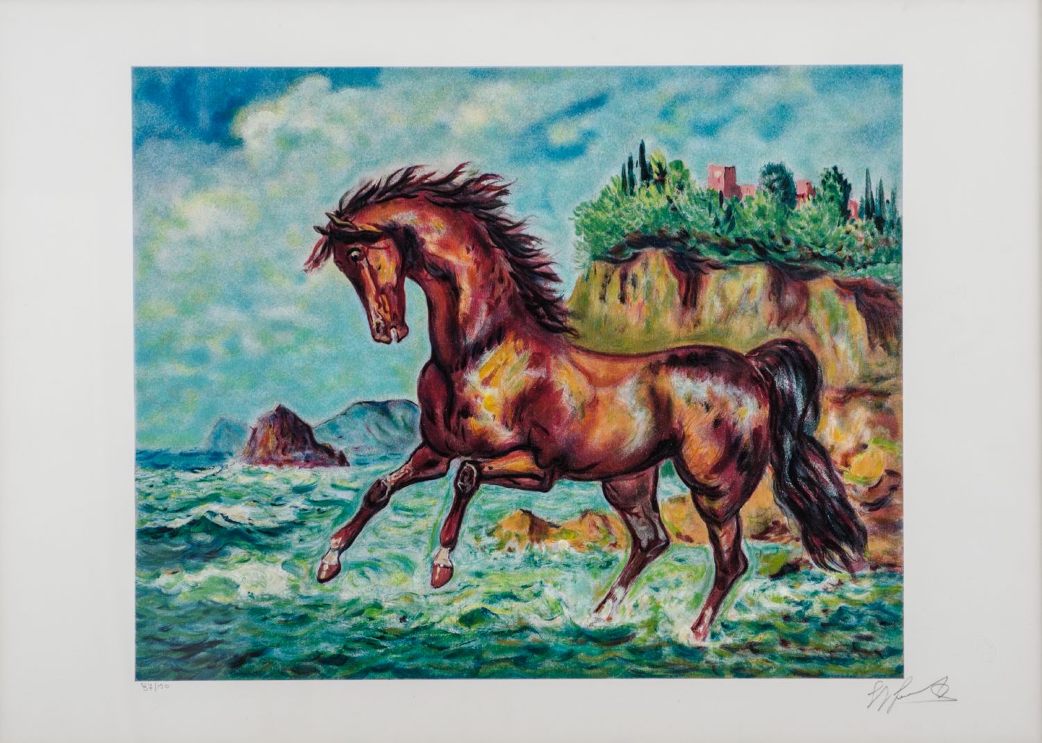 GIOVAN FRANCESCO GONZAGA (Milano 1921 - 2007) LITOGRAFIA raffigurante "paesaggio costiero con cavallo", esemplare 87/150. Misure: cm 69 x 49