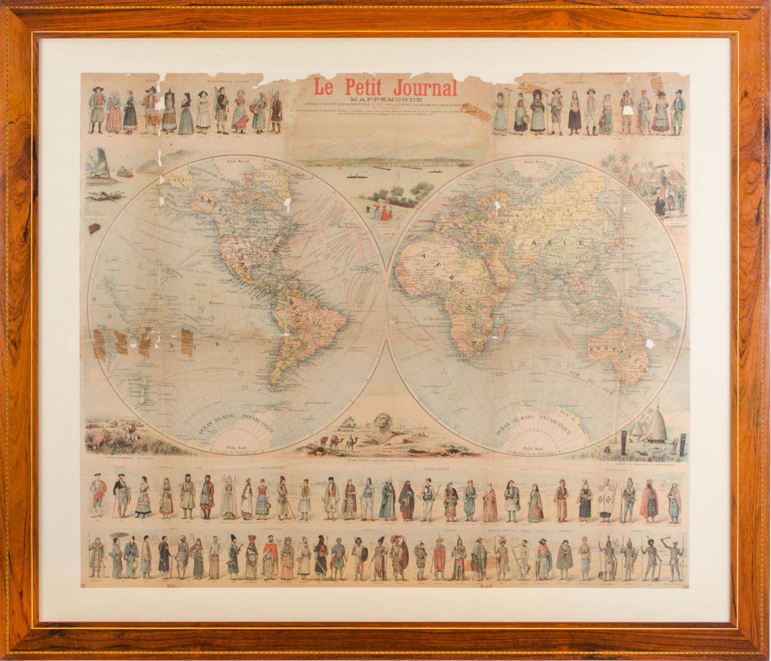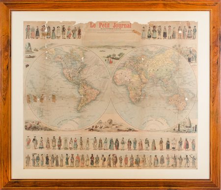 CARTA geografica raffigurante "mappamondo" entro cornice in noce perfilata. Primi '900 Misure: cm 135 x 117