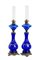 COPPIA LUMI in vetro nei toni del blu dipinti a mano a motivo fogliaceo, base in antimonio. Sicilia primi '900 Misure: h cm 77