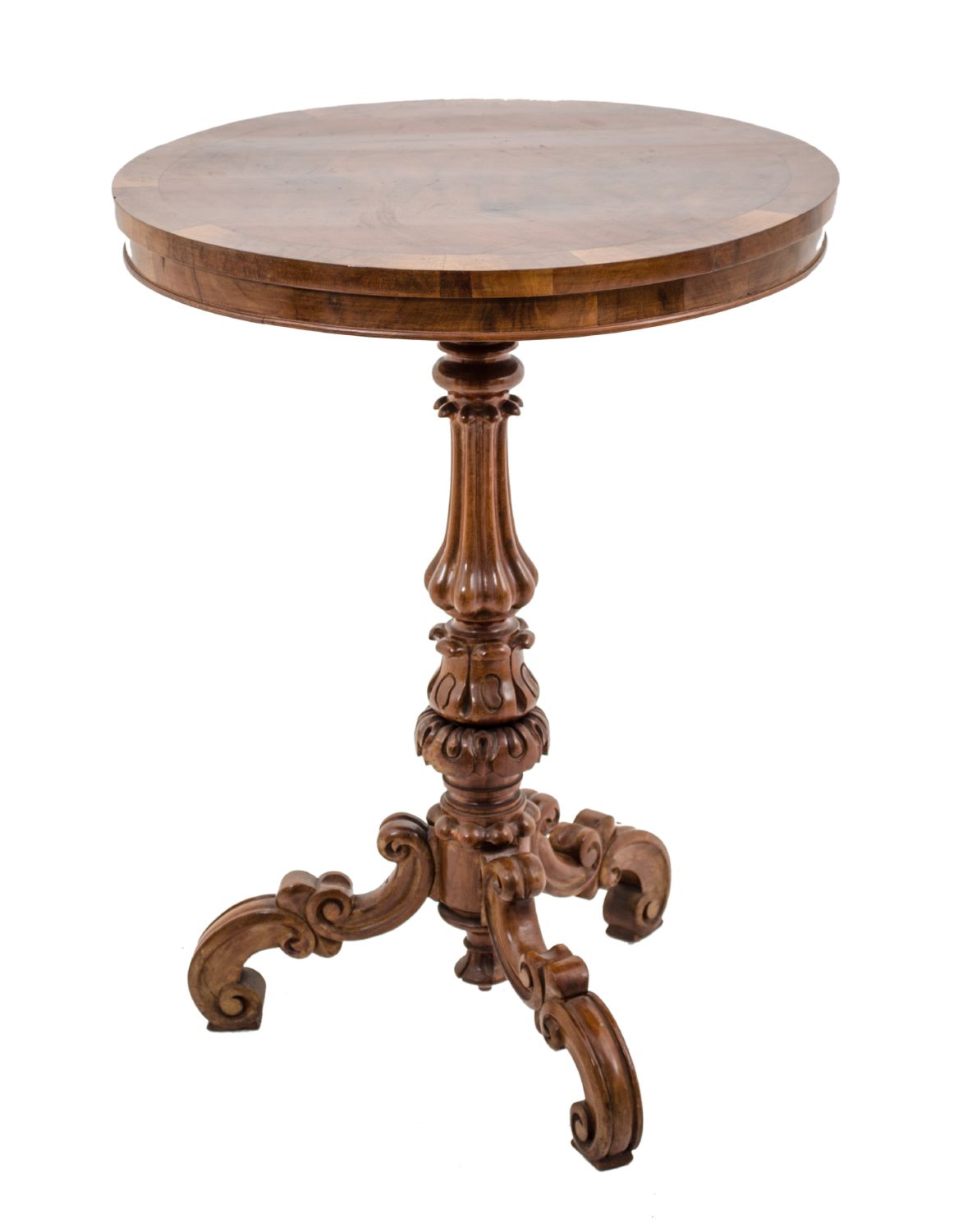 TAVOLINO tondo in mogano e piuma di mogano con bordi in radica di noce. XX...