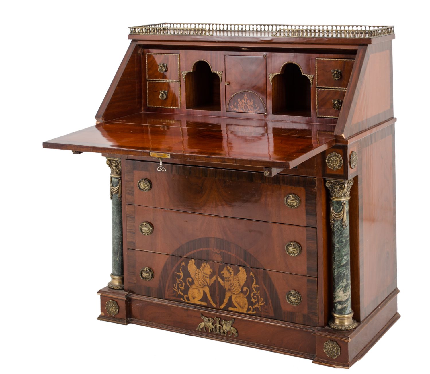 RIBALTA stile Impero con quattro cassetti in piuma di mogano e palissandro con colonne in marmo, capitelli, maniglie e fregi in bronzo. XX secolo Misure: cm 110 x 55 x h 120