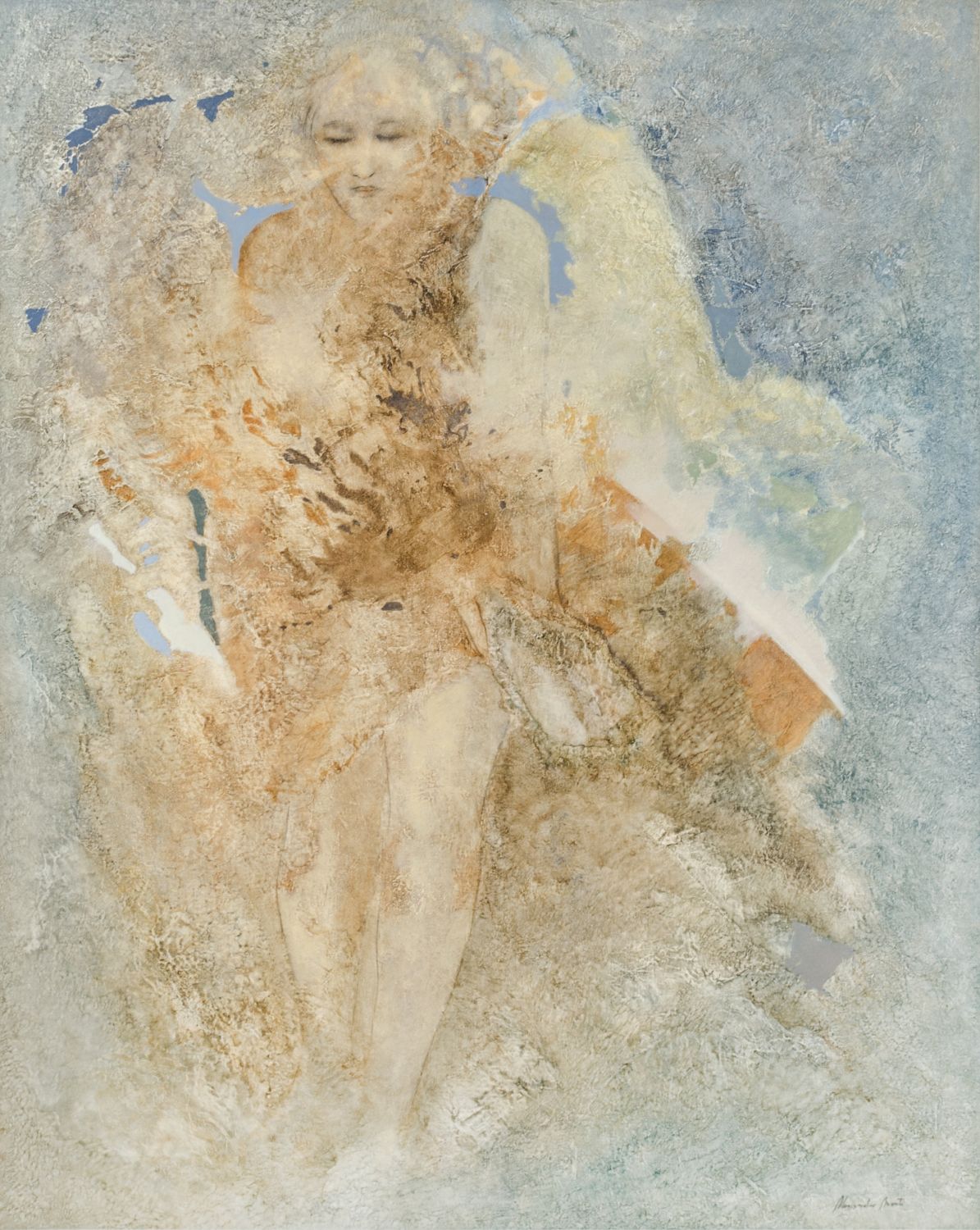 ALESSANDRO AMATO TECNICA mista su carta applicata su tela "raccoglitrice di conchiglie". XX secolo Misure: cm 95,5 x 76
