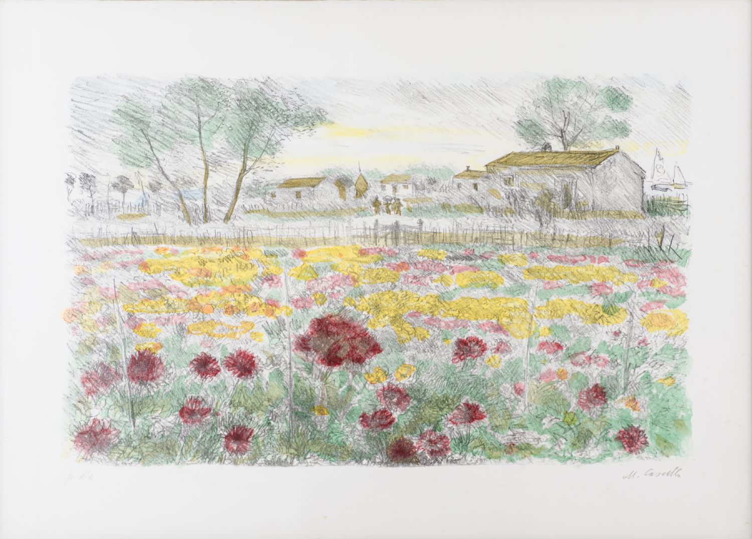 MICHELE CASCELLA (Ortona 1892 - Milano 1989) LITOGRAFIA a colori prova d'autore "paesaggio con caseggiato". Misure: cm 70 x 50