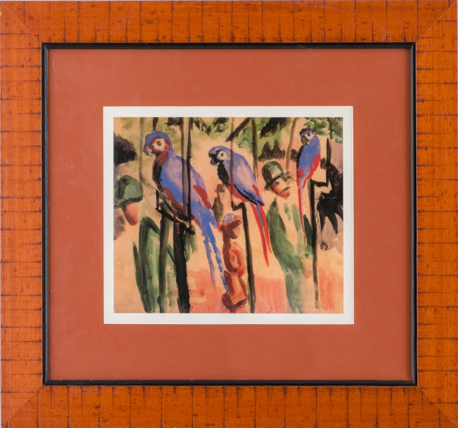 STAMPA colorata su carta "personaggi e pappagalli". XX secolo Misure: cm 25 x 22