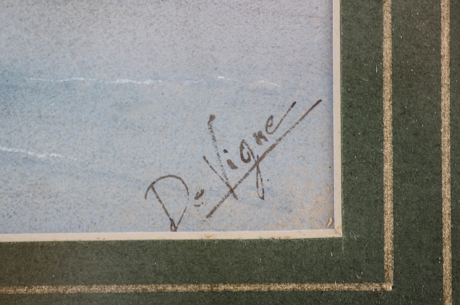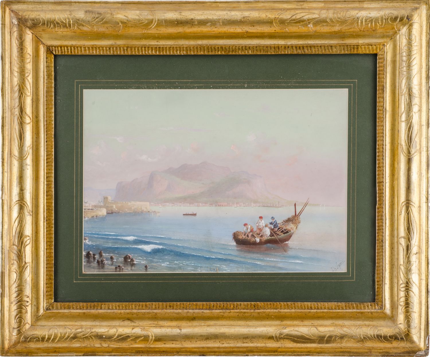 DE VIGNE TEMPERA su carta "veduta di Monte Pellegrino con barche e pescatori", firmato in basso a destra entro cornice a pagnotta in legno dorato. XIX secolo Misure: cm 47,5 x 32,5