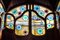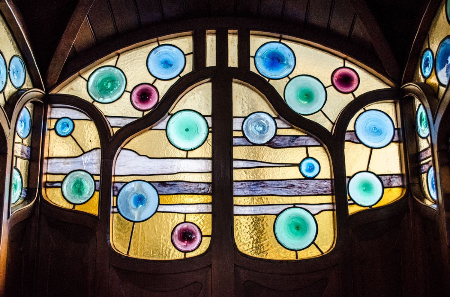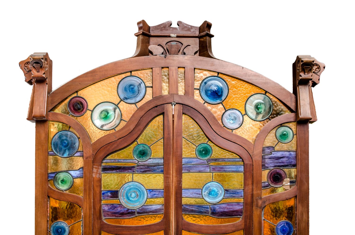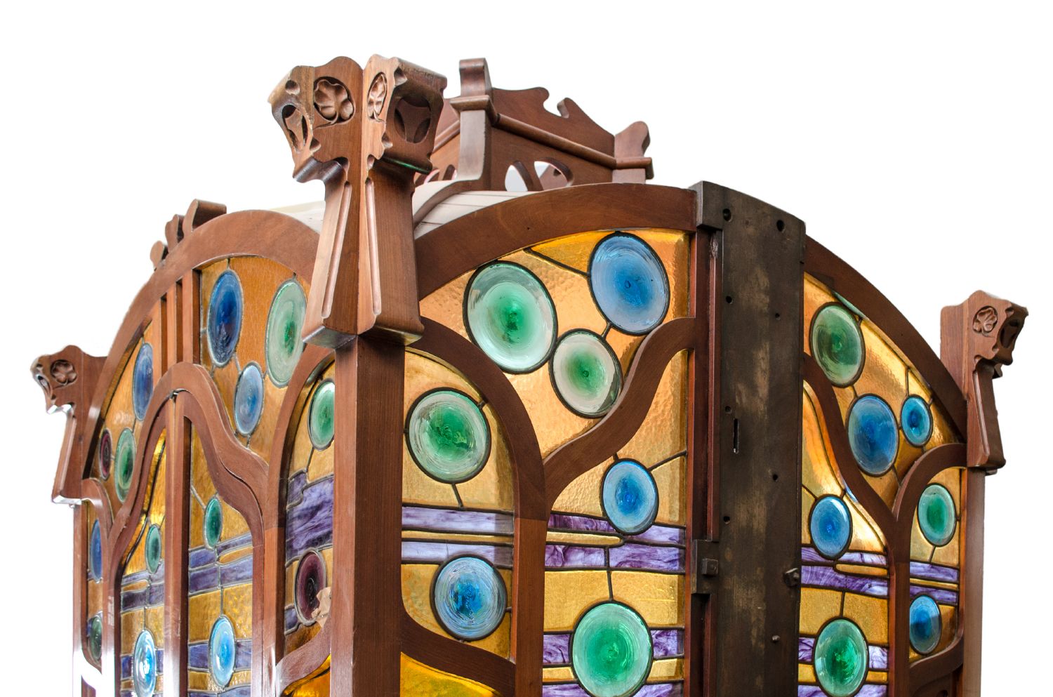 SCUOLA DEL GAUDI' (Reus 1852 - Barcellona 1926) CABINA d'ascensore Liberty in mogano con vetri policromi. Spagna primi '900 Misure: cm 135 x 127 x h 265