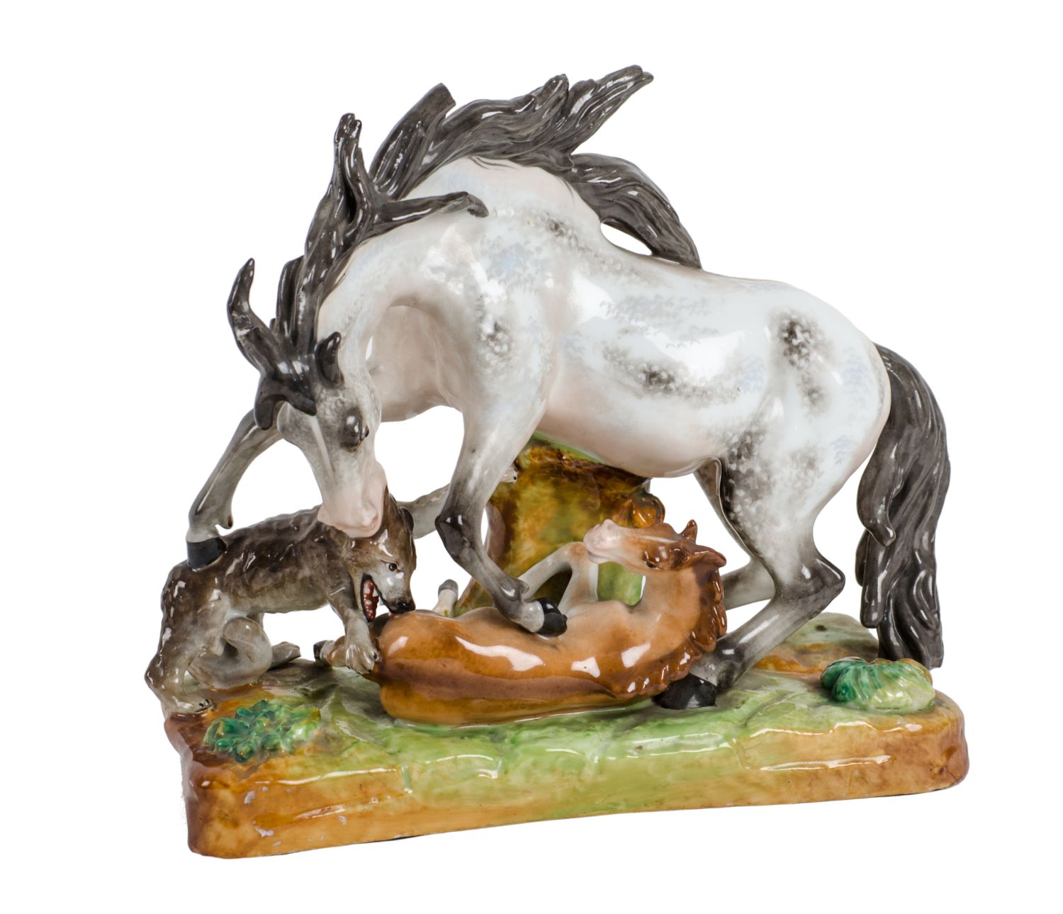 GRUPPO in maiolica policroma "scena di cacca con lupo e cavalli". XIX secolo...