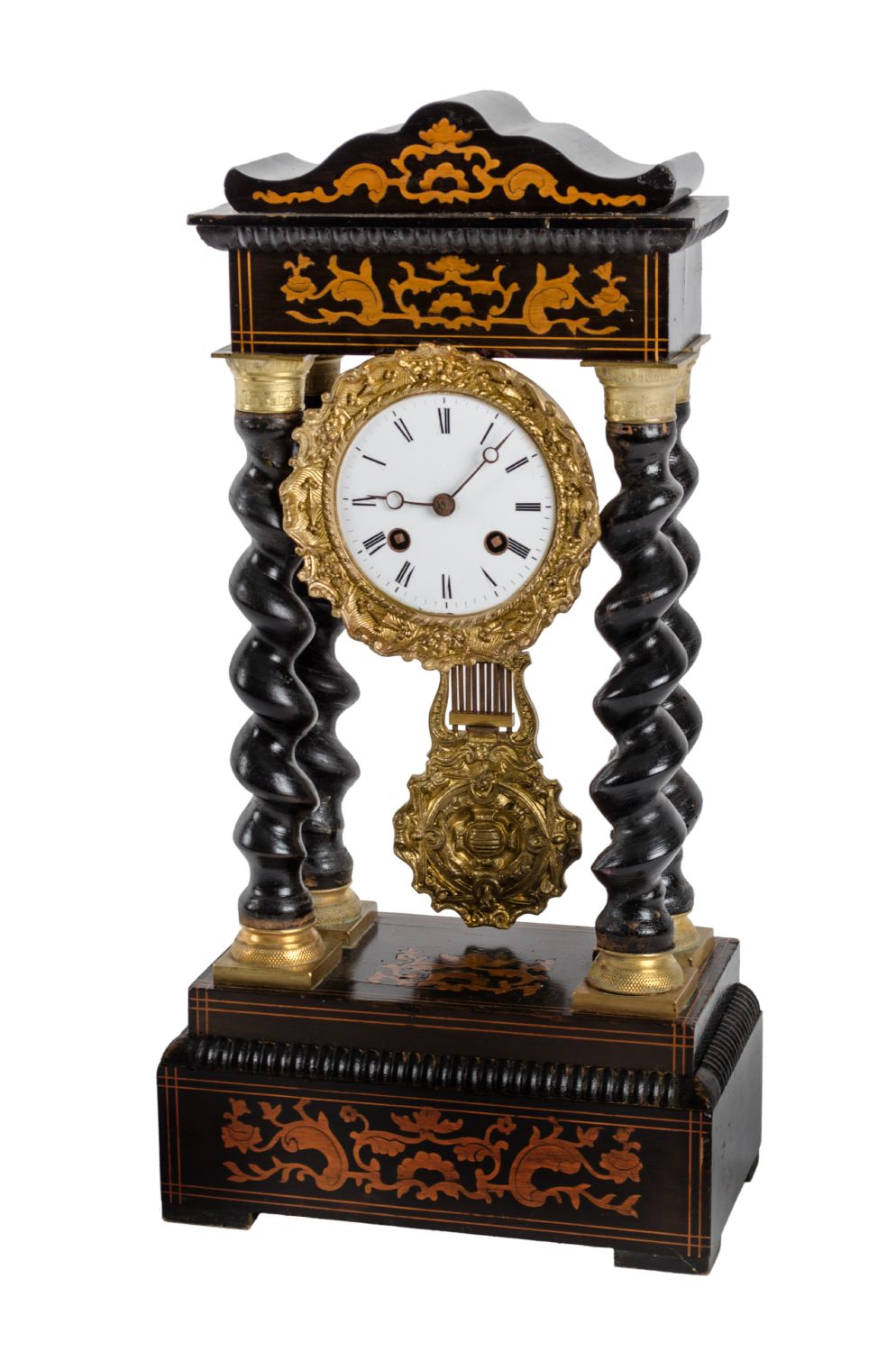 OROLOGIO a tempietto Carlo X in legno ebanizzato con colonne salomoniche, tarsie in rame e fregi in ottone dorato. Francia XIX secolo Misure: h cm 44