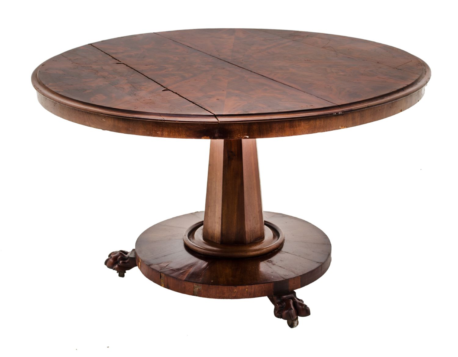 TAVOLO tondo in mogano e piuma di mogano. Inghilterra periodo Vittoriano XIX secolo Misure: diametro cm 120 x h 73