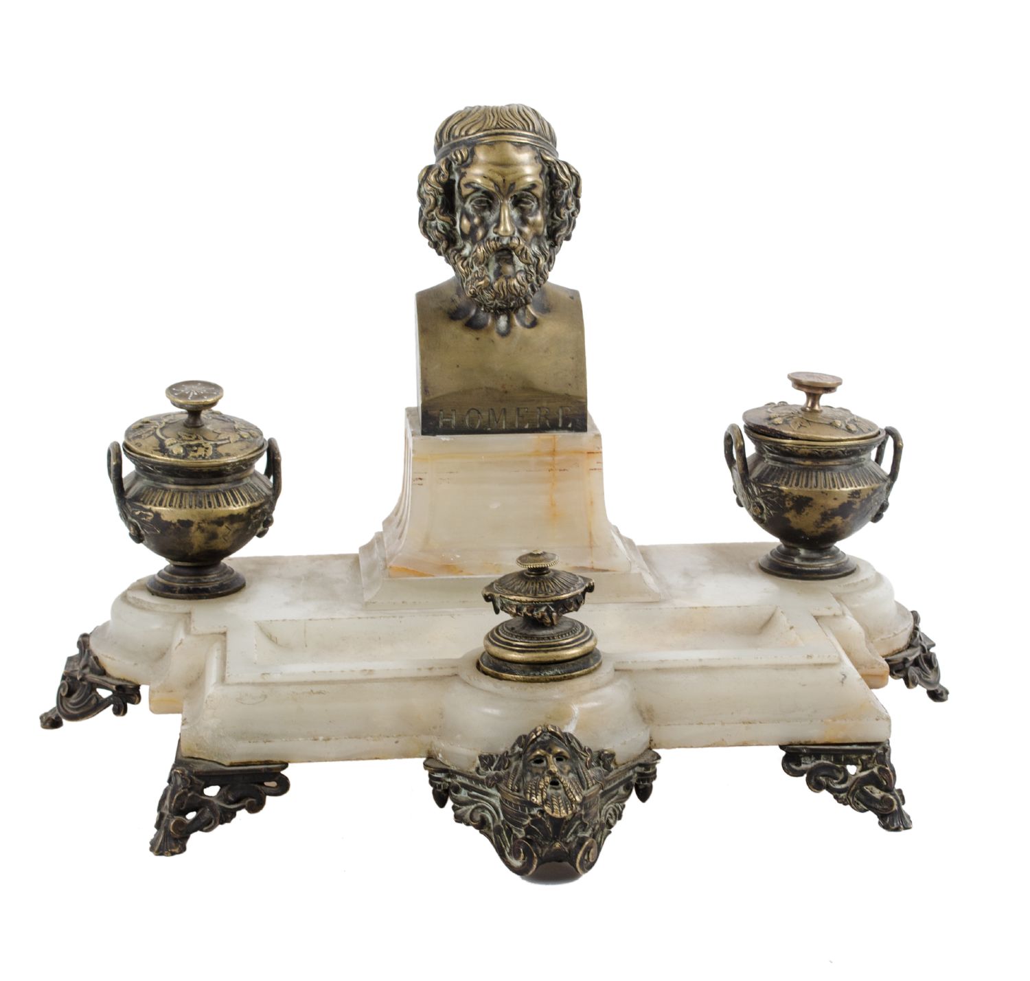 CALAMAIERA in bronzo ed onice con scultura raffigurante "mezzo busto di Omero". Francia XIX secolo Misure: cm 43 x 28 x h 31
