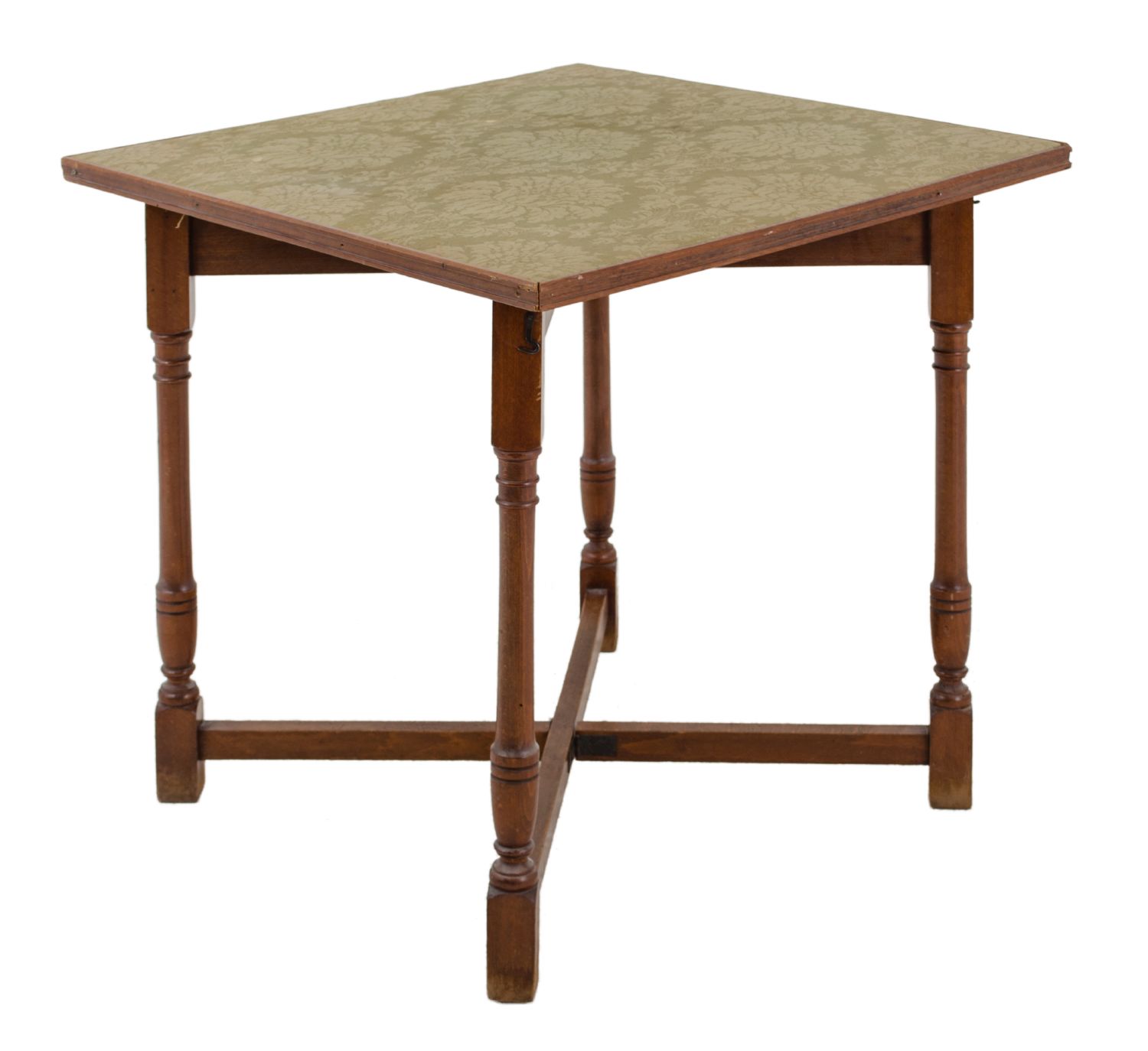 TAVOLO da gioco quadrato in legno di mogano con piano in stoffa e piede a crociera richiudibile. Meta' '900 Misure: cm 74 x 7 x h 72