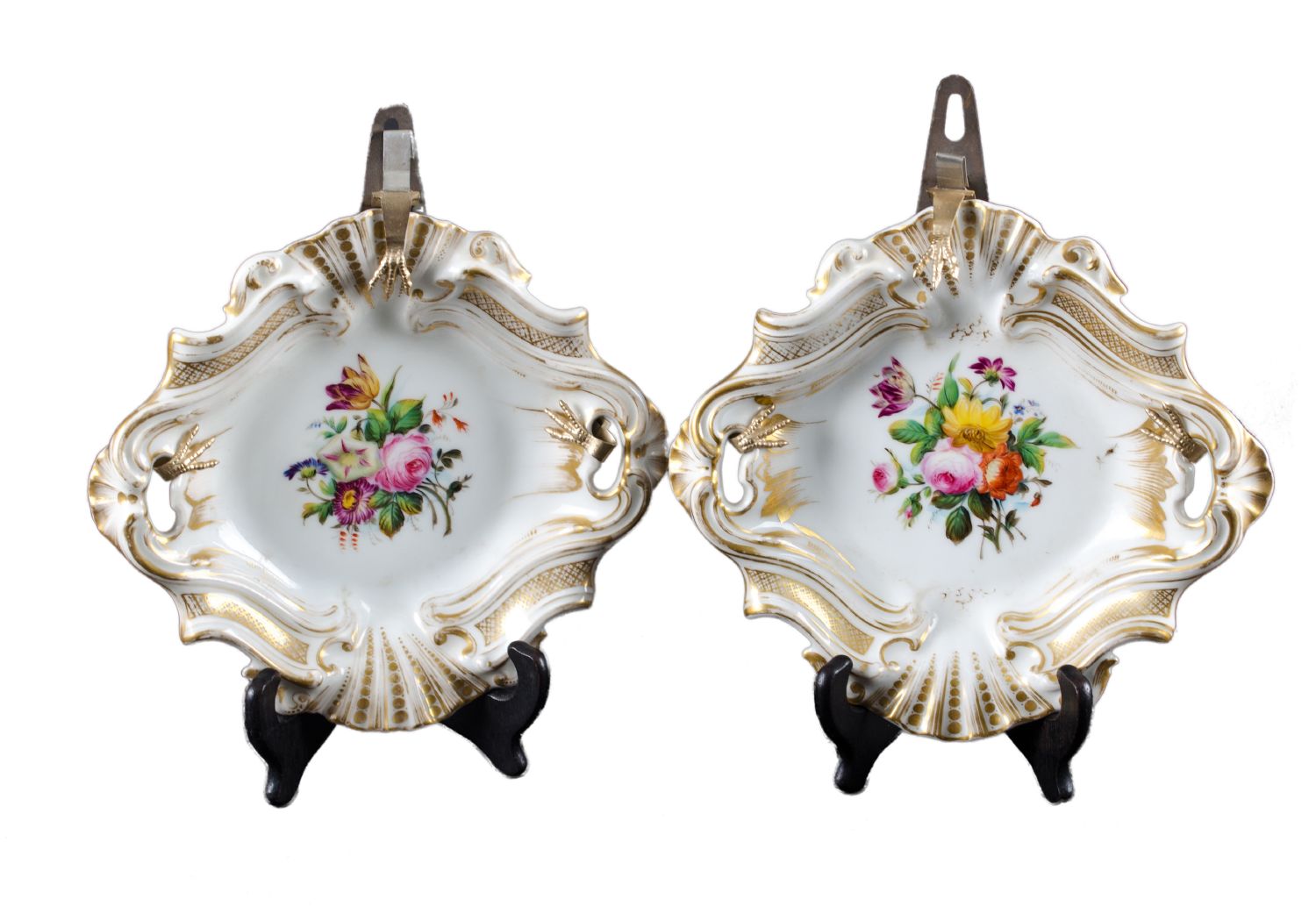COPPIA CENTROTAVOLA Luigi Filippo in porcellana decorata e lumeggiata in oro. Francia XIX secolo Misure: cm 22 x 24