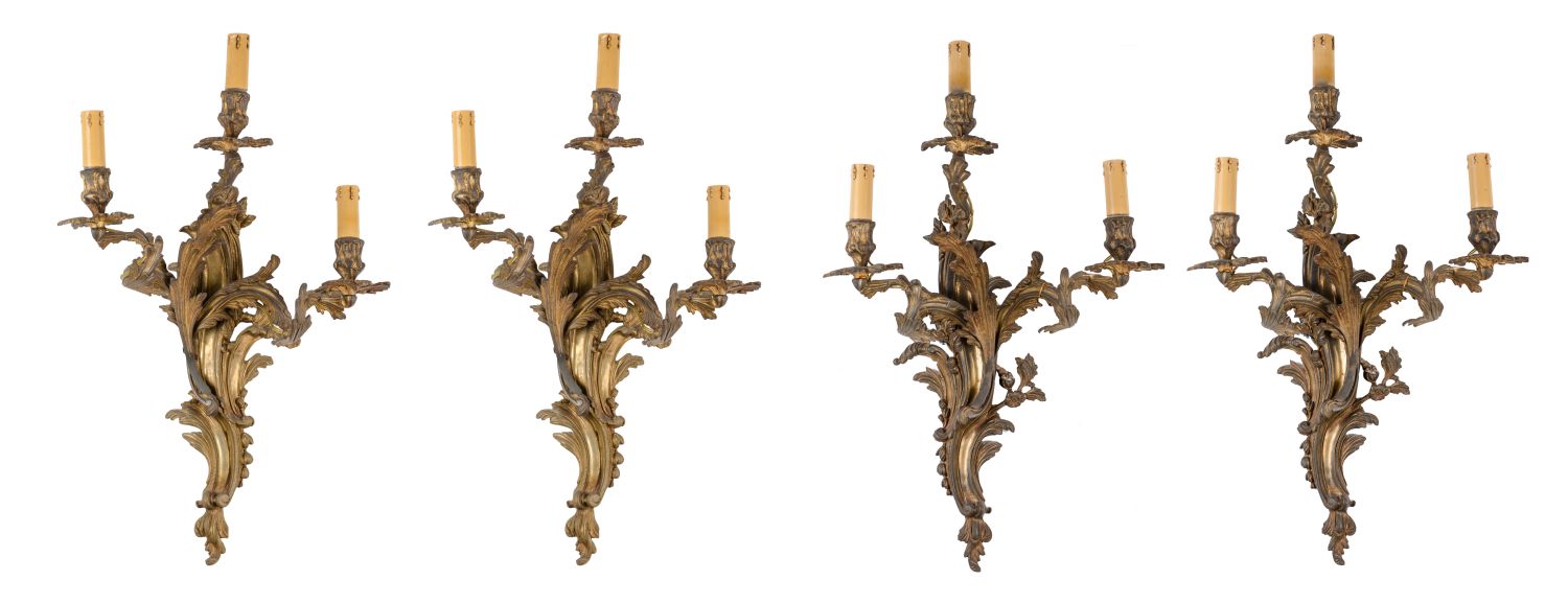 QUATTRO APPLIQUES a tre luci in bronzo lavorato a motivo floreale e...