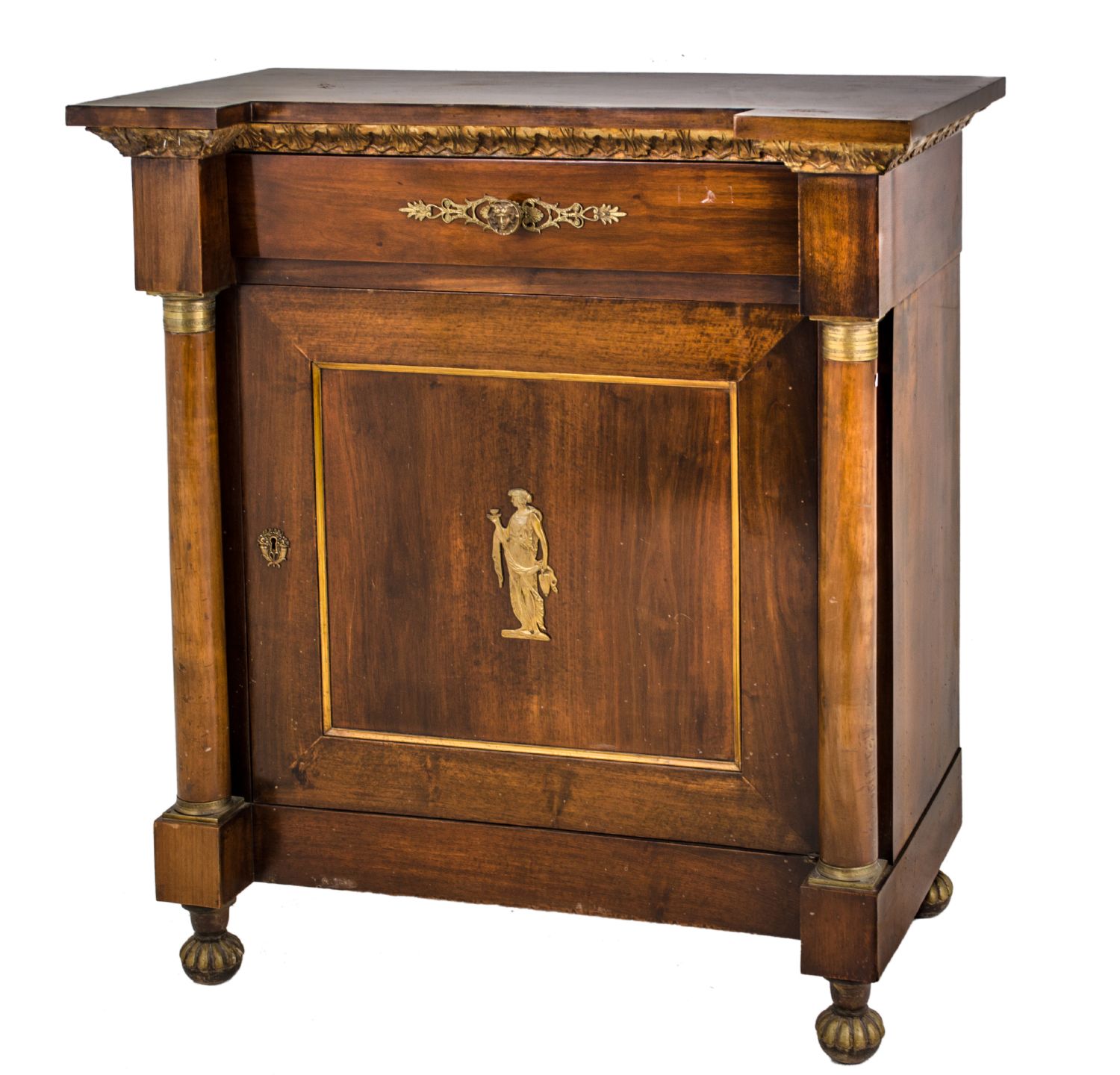 CREDENZINA stile Impero in noce ad un'anta con cassetto sovrastante, guarnizioni in bronzo. Italia fine '800 Misure: cm 101 x 56 x h 111