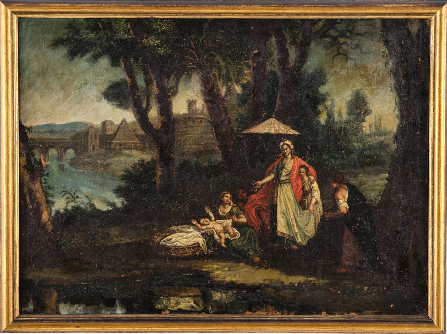 OLIO su tela "Mosè salvato dalle acque". Italia XVIII secolo Misure: cm 69 x 50