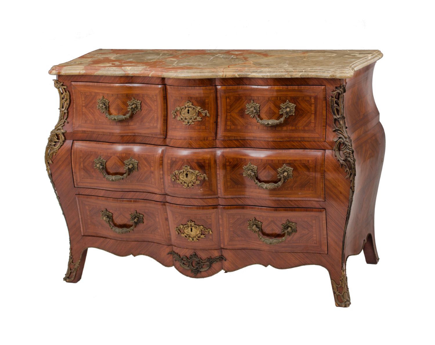 CASSETTONE stile Luigi XV in bois de rose a tre cassetti con due cassettini, piano in marmo venato. Italia meta' '900 Misure: cm 131 x 51 x h 90