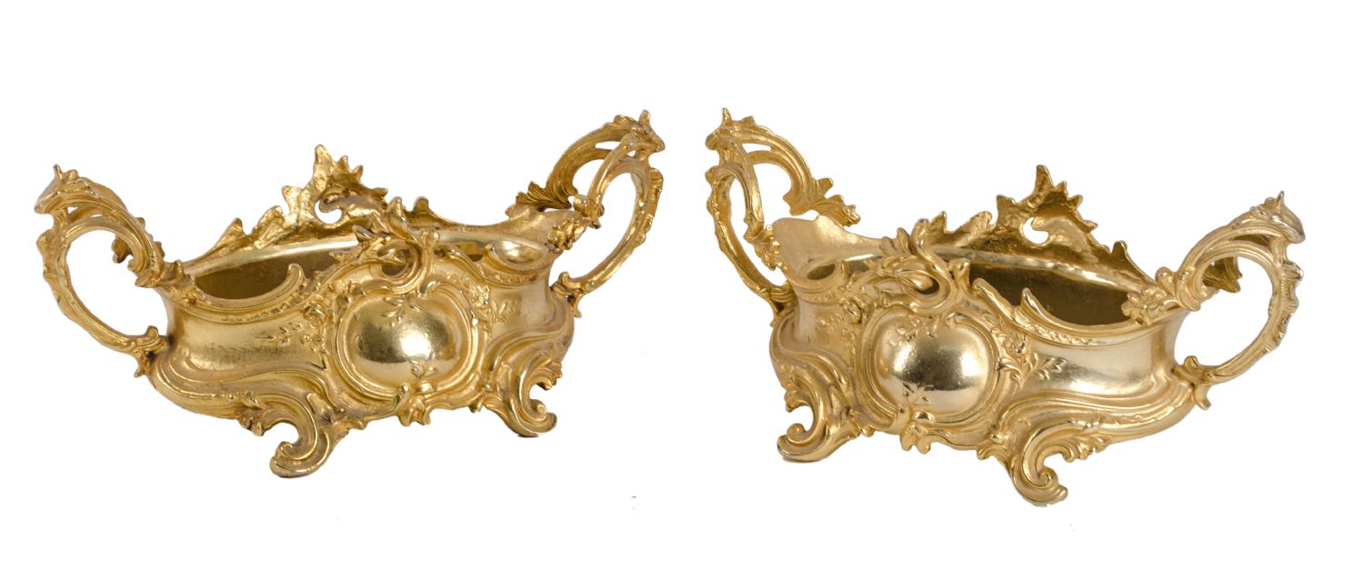 COPPIA CENTROTAVOLA in bronzo dorato con vaschette in ottone. Primi '900...