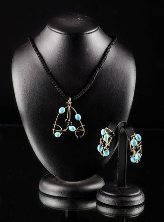 PARURE in oro giallo 18 kt con turchesi ed onice composto da ORECCHINI e da PENDENTE con cordoncino in seta e susta in oro giallo 18 Kt.